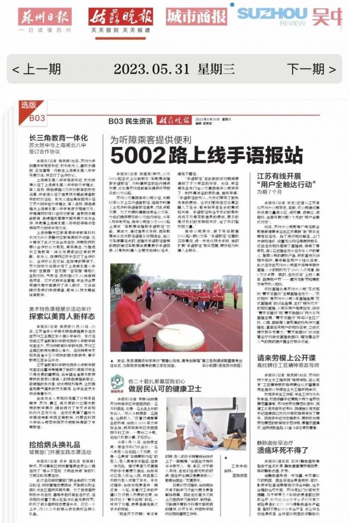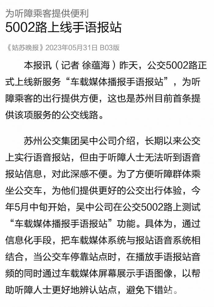 公交车上语音报站器正播放着到站信息,同步车上的电子显示屏内亲切的AI虚拟人物正将站点信息用手语表达出来。这是2023年5月,苏州首条提供“车载媒体播报手语报站”服务的公交线路5002路给大家带来的惊喜,受到了媒体的广泛关注。