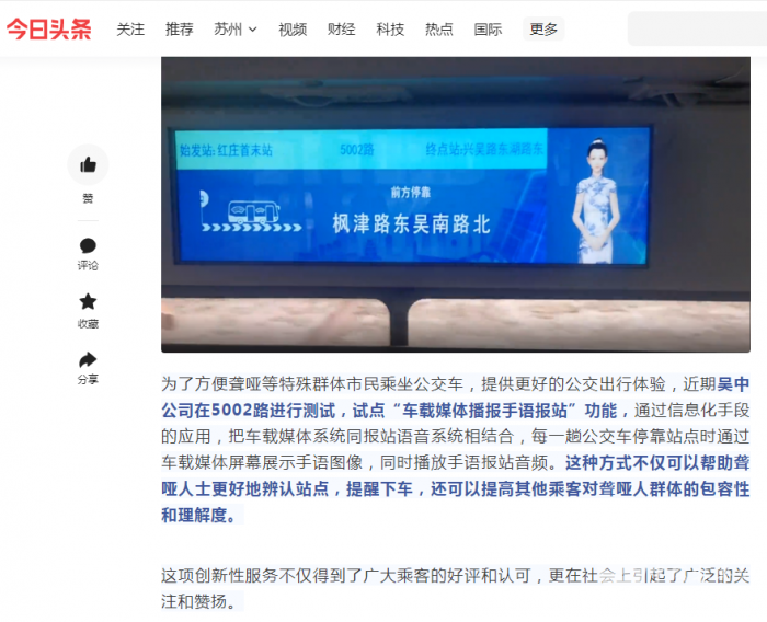 助力听障人士出行 苏州公交“车载媒体播报手语报站”再上线