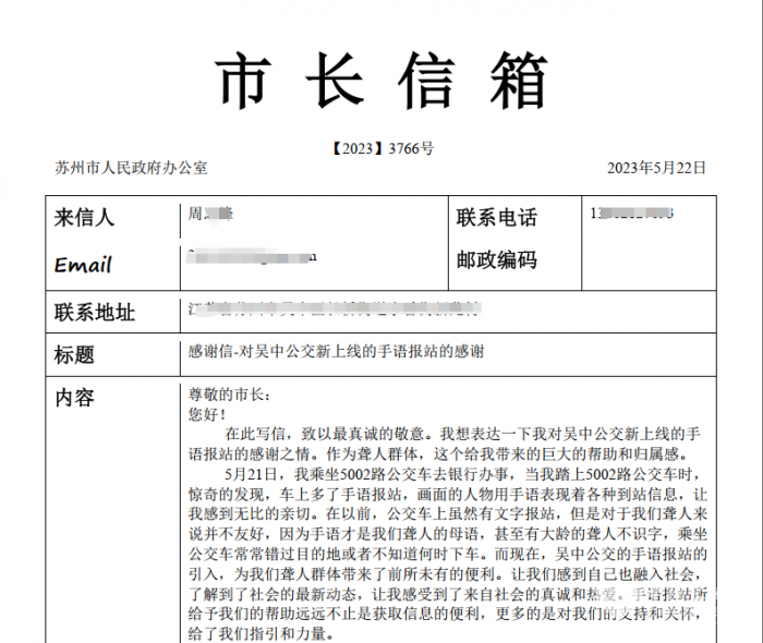 很多市民乘客在“尝鲜”后也给予了高度的评价。乘客周先生还专门写了表扬信:“手语报站的引入,为我们带来了前所未有的便利。让我们感到自己也真正融入了社会,感受到来自社会的真诚和热爱。手语报站给予我们的帮助远远不止是获取信息的便利,更多的是对我们的关怀,给了我们指引和力量。”