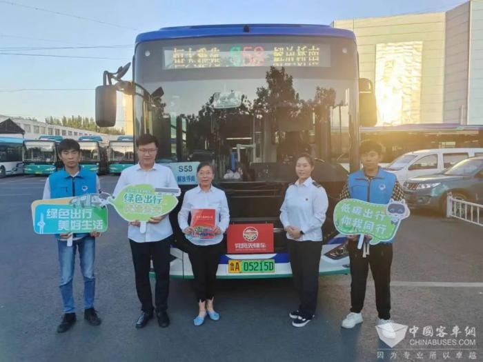 2023年9月22日一早,公交出行宣传周期间,济南公交西部公司对定制公交S58路进行车内装扮,用绿色植被对拉环上的扶手杆进行装饰,车辆座椅上放置抱枕,赠送给每位坐车乘客。