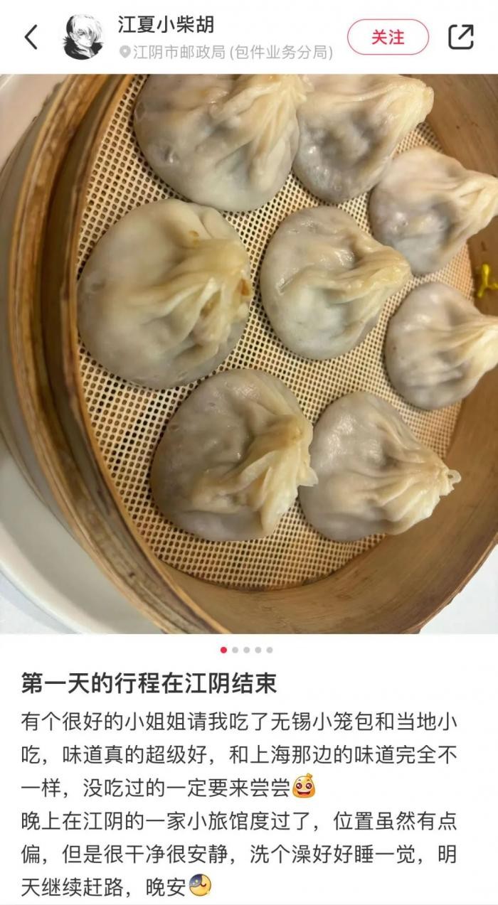 晚上抵达江阴后,江夏品尝了无锡特色小吃小笼包,觉得味道超级好。