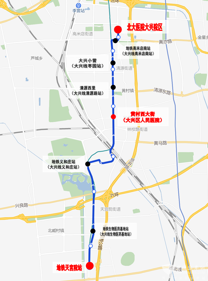 方便天宫院、义和庄等周边社区前往大兴区人民医院、北大医院大兴院区就医出行。