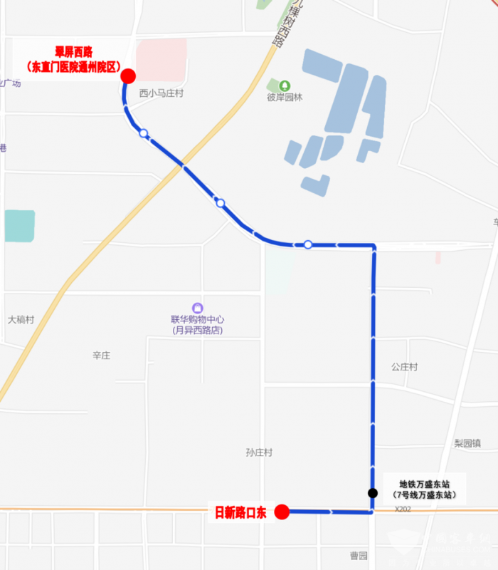 沿途设站:日新路口东、地铁万盛东站、天地美墅、龙鼎家园、西小马庄园、翠屏西路(东直门医院通州院区)。
