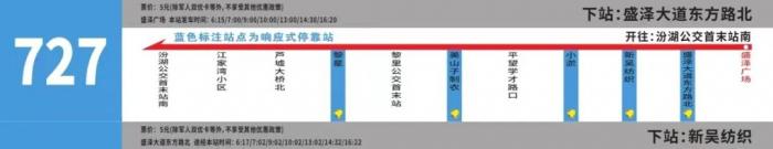 运营时间:盛泽广场6:15、7:00、9:00、10:00、13:00、14:30、16:20;汾湖公交首末站7:30、8:30、10:20、13:00、14:30、16:00、17:30;沿途停靠:汾湖公交首末站南、江家湾小区、芦墟大桥北、黎星、黎里公交首末站、美山子制衣、平望学才路口、小淤、新吴纺织、盛泽大道东方路北、盛泽广场(蓝色标注为“响应式停靠”站点)。
