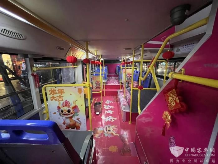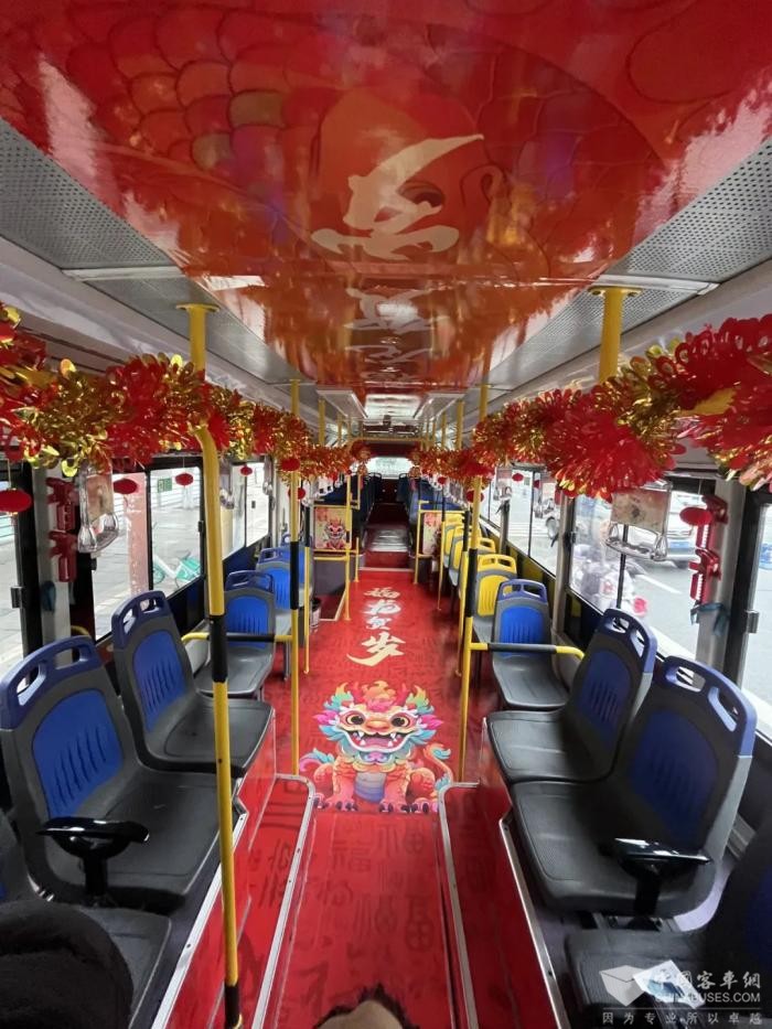 为保证新春贺岁主题车的服务品质,参营的车长由公司精心选拔,驾驶技术精湛、服务优良且颜值在线。两台车的车厢地板、顶部和车内设施均涂装寓意着祥瑞好运的新春元素,也借“龙”这一中华民族的吉祥图腾,传递出满怀希望、自信向上的民族气魄,营造出红火、喜庆的节日氛围。