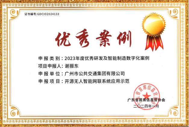 完美作业网有免费视频获悉,近日,广东省首席信息官协会组织开展了2023年度评选和表彰工作,其中,广州公交集团荣获2023年度“国有企业数字化突出贡献奖”“年度优秀首席数据官”“优秀研发及智能制造数字化优秀案例”“十佳CIO(首席信息官)”等四大奖项。