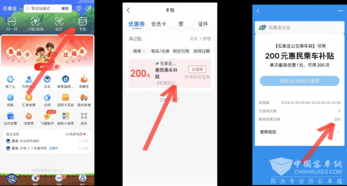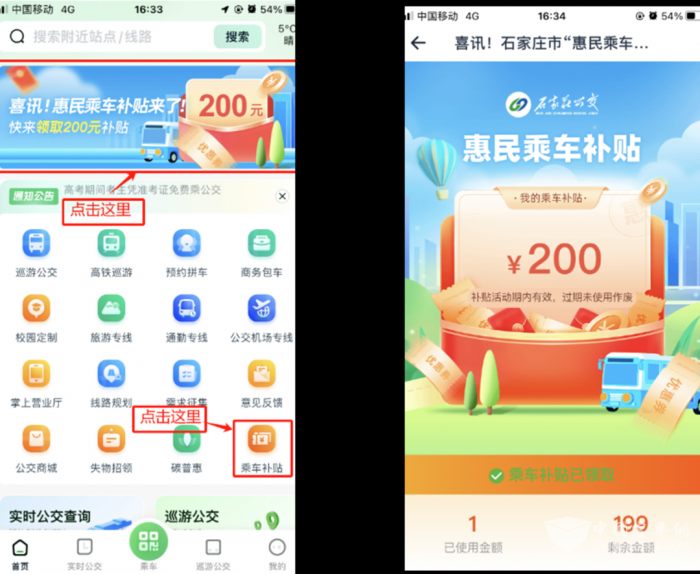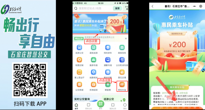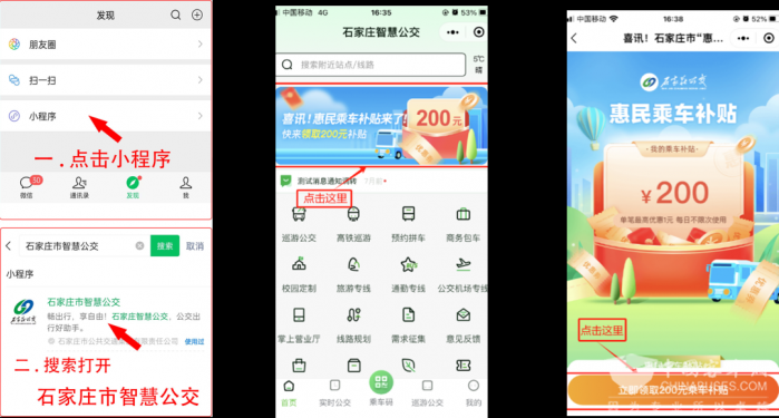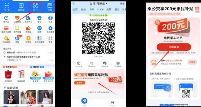 活动期间,石家庄市民通过石家庄智慧公交APP、微信、支付宝三种渠道,进入“乘车码”界面,均可领取200元惠民乘车补贴。领取方式如下: