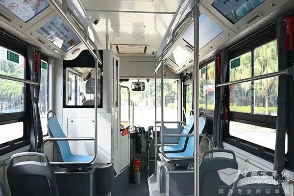 二是适老化设计亮点满满:该批公交车采用低入口设计,方便老幼乘客一步登乘。乘客上下车只需要踏一级踏步,车厢内,从前上客门到后下客门为全平地板,大通道大空间不仅让乘客乘坐舒适,行走也更方便安全。