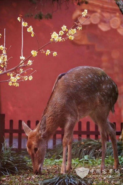 龙腾盛世迎新年,花开“梅”好展新篇,明孝陵红墙背景下,小鹿和腊梅的同框,传递出浓浓的年味。