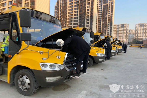 严格按照检测标准对校车的外观,车辆的转向、制动、灯光、底盘等项目进行上线检测,对校车的标志灯、停车指示牌、急救箱、倒车装置等校车特有硬件装备进行了专项检查,确保开学后每一辆校车能够安全、平稳运行。