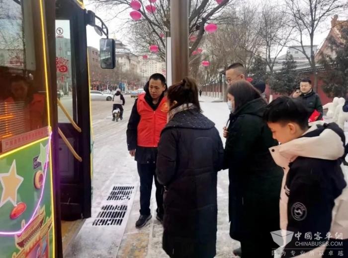 在炫彩观光巴士上,宣讲员向乘客介绍青城美景的同时,也提示乘客在雪天切勿追赶公交车辆,以免摔倒受伤;候车时文明乘车,等待车辆停稳后有序上车;提醒乘客扶好站稳。