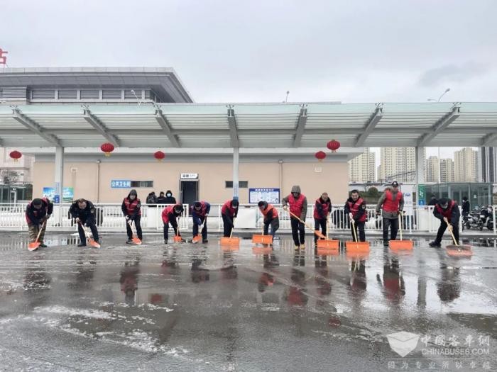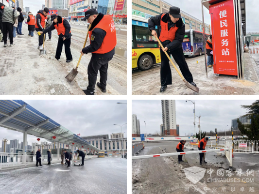 公司组织人员对各交通枢纽、公交场站进出口、急弯、客流量大的站点棚牌铺撒融雪剂,全力除雪,保障车辆顺利通行。