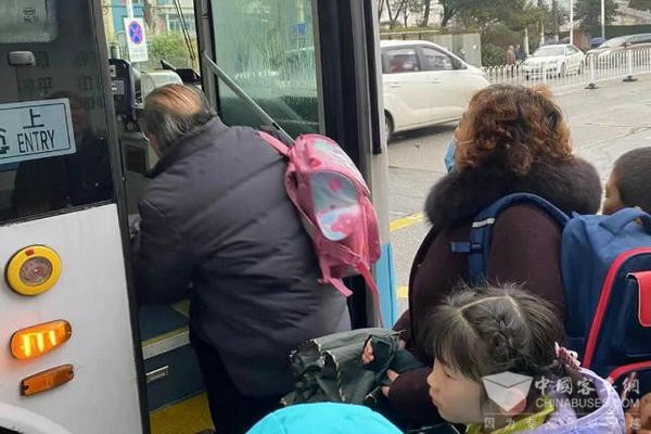 2月21日,清晨7:20,开学第一天,遇上大风加降雨。为保障学生们安全乘车,“求知线”和“通学线”的管理人员在多个学校门口开展志愿服务,提醒学生们小心地滑,并搀扶学生上车,引导现场秩序。