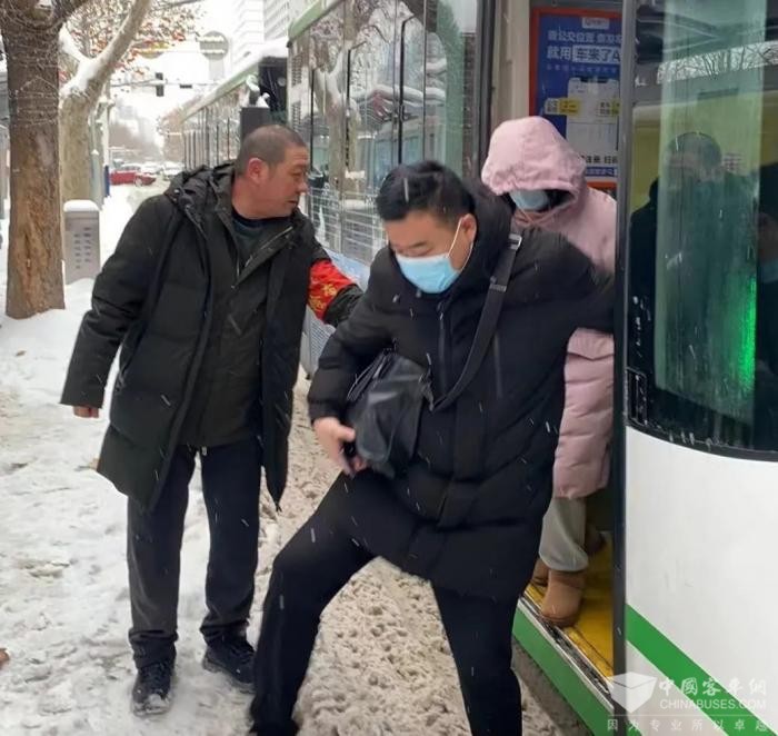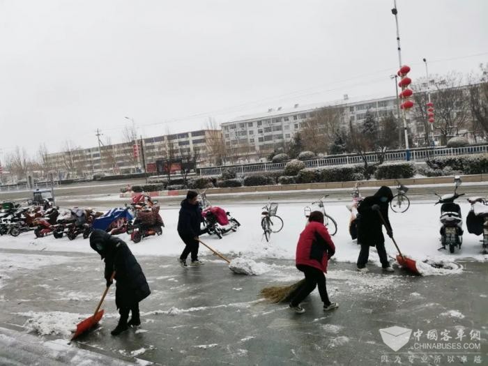 为保障市民的安全出行,公司根据天气预警,提前一天对车辆的灯光、刹车、空调等重点部位进行了全面检查,确保车辆状况良好;密切关注降雪及路面情况,通过车载智能设备及时发送雪天行车注意事项,管理人员利用车长发车前的间隙,面对面叮嘱车长控制车速,提高安全防范意识;车长也早早到达工作岗位,提前开启车内暖风,清理车厢地板积雪,为乘客提供温馨、优质的出行服务;公交志愿者们到各大站点开展志愿服务,引导市民乘车、清理站台积雪,提醒乘客注意安全。