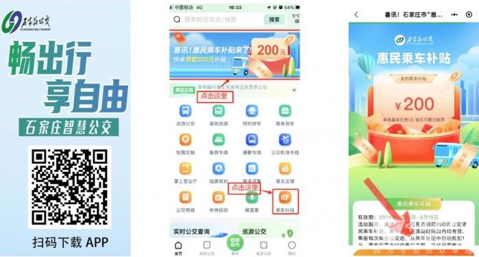 活动期间,石家庄市民通过石家庄智慧公交APP、微信、支付宝三种渠道,进入“乘车码”界面,均可领取200元惠民乘车补贴。领取方式如下: