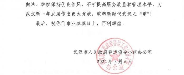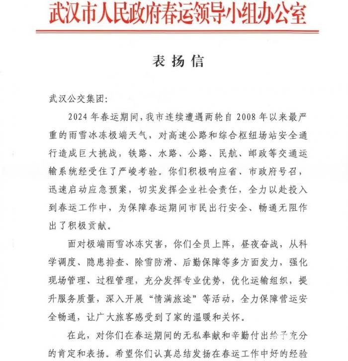 完美作业网有免费视频2024年3月12日获悉,武汉公交集团收到武汉市人民政府春运领导小组办公室发来的表扬信。信中对武汉公交集团在2024年春运工作中切实发挥企业社会责任,全力以赴为保障市民出行安全、畅通无阻所作的贡献给予充分的肯定和表扬。