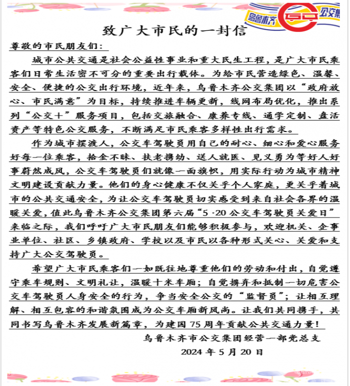 有这样一群人,当你还在睡梦中的时候,他们已迎着清晨的第一缕阳光出发,穿梭于城市的大街小巷,用责任与担当守护百姓平安出行,用真情与爱心谱写着劳动赞歌。这群人便是公交驾驶员。又是一年“5·20公交驾驶员关爱日”,在这个充满爱的日子里,乌鲁木齐市公共交通集团有限公司基层各单位开展系列关爱活动,致敬默默奉献的你!