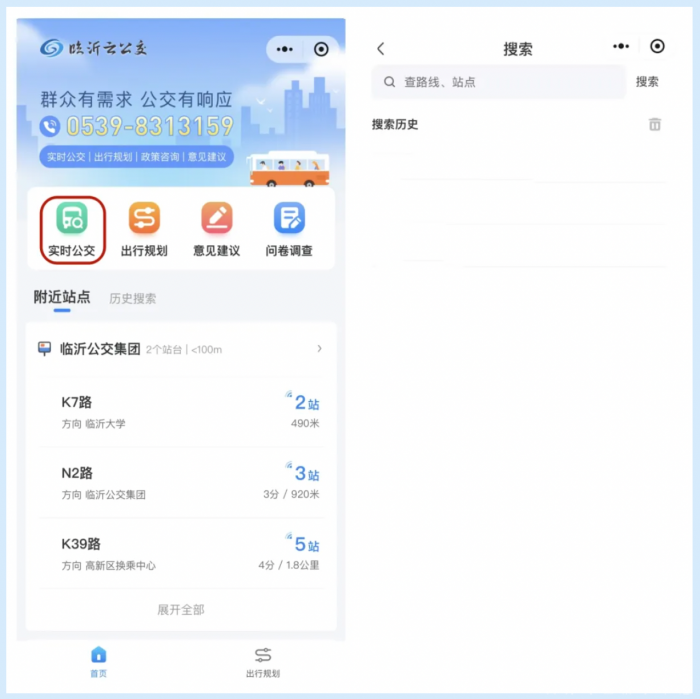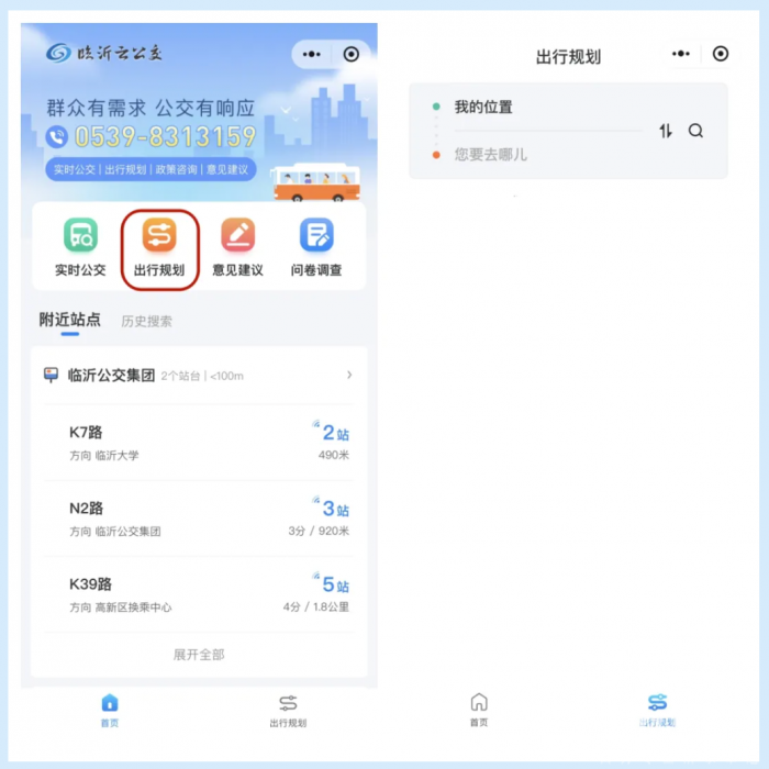 点击“出行规划”,可根据个人出行需求,输入起点和终点,小程序将智能规划出最佳乘车路线,同时提供车辆预计到站时间和换乘建议,让出行更加高效。