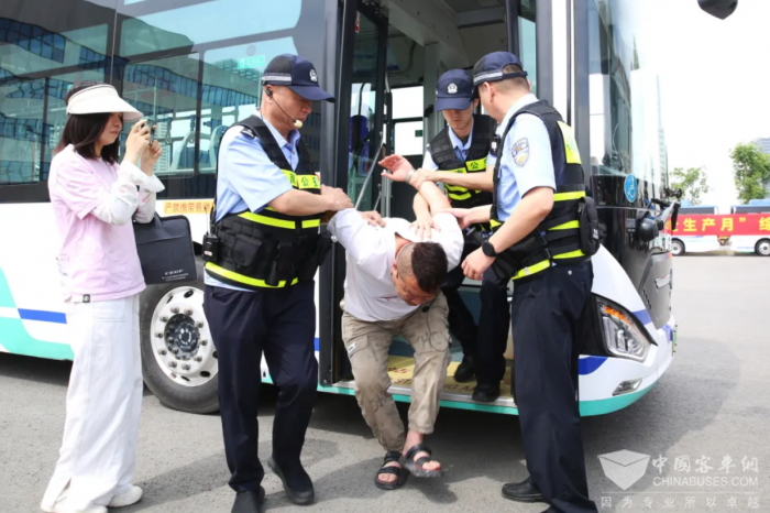 一辆公交车进站后,一名乘客携带装有不明液体的塑料桶乘车。驾驶员按照防恐安全检查规定履行安检职责,发现该乘客携带的是易燃易爆物品。驾驶员对其进行劝阻,乘客拒不配合,情绪激动并意图抢夺方向盘。紧急情况下,驾驶员打开车门疏散乘客,并拨打110报警,最后由民警对拒不配合且有暴力倾向的乘客及时控制,将其带回公安机关做出进一步处理,公交车驶离现场。
