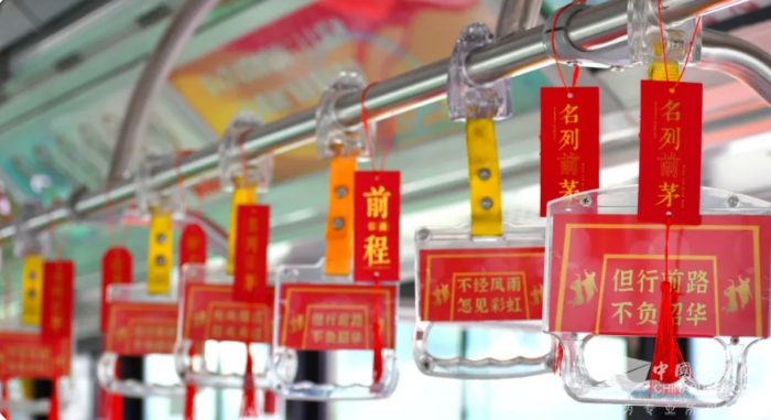 本次为考生加油而定制的“万试如意”高考主题巴士为车牌号“666”的车辆,以“红、黄”两色为主色调,设计鲤跃龙门车身,用红色寓意锦鲤加持考试开门红。车内拉环、扶手等布置了高考相关祝福装饰。
