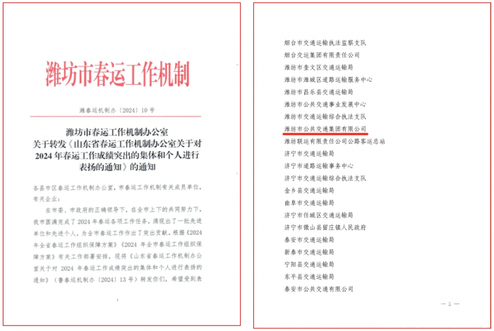 近日,山东省春运工作机制办公室印发《关于对2024年春运工作成绩突出的集体和个人进行表扬的通知》,其中,潍坊公交集团被评为“2024年春运工作成绩突出集体”。