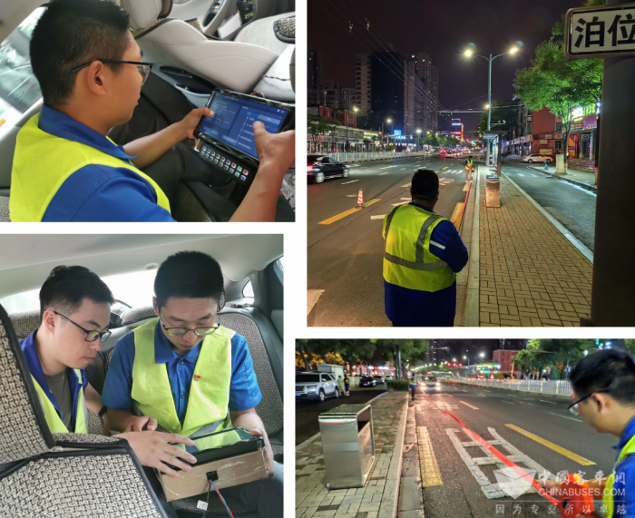 随着企业智能化、数字化发展的需求,智慧站台建设无疑是方便市民出行、优化线网管理、提升企业服务品质的重要举措,为确保智慧站台发挥智能交通的作用,集团公司对保修厂下达了智慧站台经纬度定位的工作要求。时间紧、任务重,2024年7月2日,在接到集团公司运调处任务的第一时间,保修厂快速响应、周密部署,制定了“夜间市区、白天周边”工作进度安排,成立了由“党员示范岗”张强为组长的维修小组,在21:00全市晚高峰结束后,冒雨上线,从并州南路亲贤北街口智慧站台开始进行经纬度定位数据的采集。