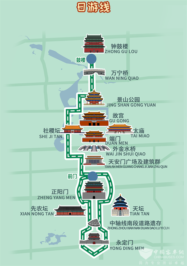 首末站前门-鼓楼,发车时间:每日10:00-17:00,线路长度12公里,中途不设站,单向运营,沿途经过正阳门、永定门、天坛、天安门广场、故宫、景山公园、万宁桥、钟鼓楼等景点,票价50元/人,包含讲解服务,车上可选购文创产品。