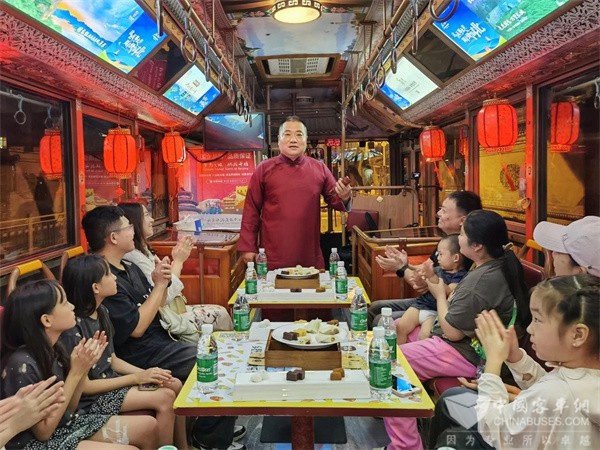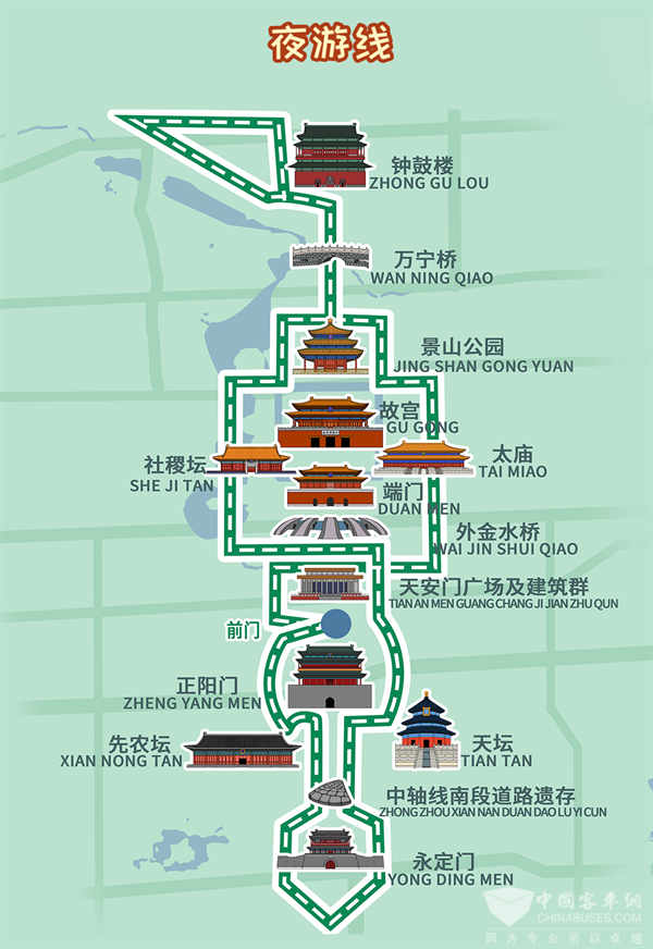 首末站前门-前门,采取游客在官方线上平台预订方式乘车,计划发车时间为19:00,线路长度25公里,中途不设站,沿途经过正阳门、永定门、天坛、天安门广场、故宫、景山公园、万宁桥、钟鼓楼等景点,票价268元/人(至少提前1天线上预订,满10人发车,1.3米以下儿童不占座免费),包含讲解服务、曲艺表演、京味烤鸭套餐或西式简餐,车上可选购文创产品。