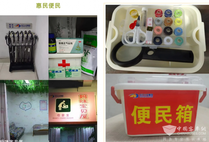 在便民服务驿站即内江公交高铁北站站务室,便民设施、贴心小物件应有尽有,母婴室、休息桌椅、沙发、按摩椅、放大镜、老花镜、便民贴、急救防暑药品......除此之外,这里还有一群服务好帮手。饮水设施安静地伫立在一旁,等待着为奔波劳累的乘客送上一份清凉与滋润;小小的针线包乖巧湿馨,当乘客的衣物出现意外破损时,它不仅可以缝好衣物,解决乘客的困境,更是串起了内江公交与乘客的心;站务室药箱里的防暑降温药品暖心守护,在酷暑难耐时,为乘客的健康保驾护航。若遇到突如其来的降雨,乘客们也无需惊慌,内江公交的爱心雨伞会撑起一片晴空,让其在雨中也能安心前行。