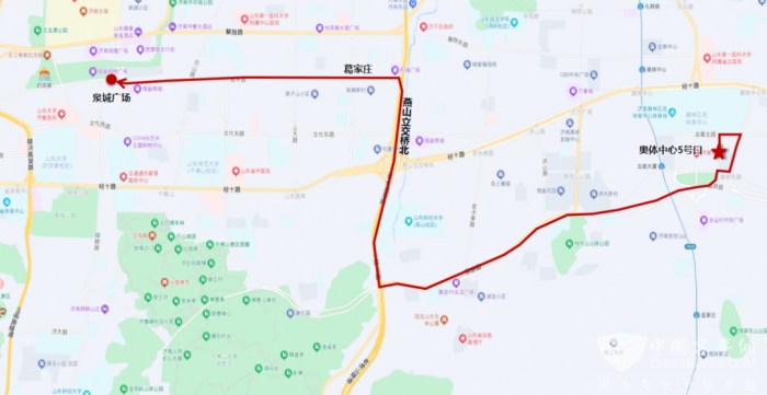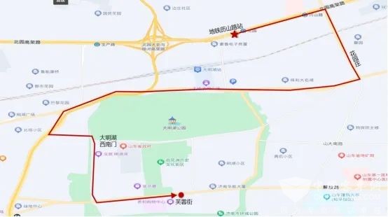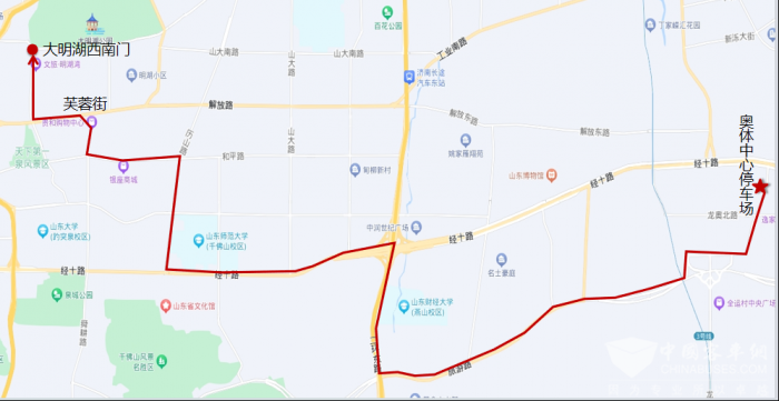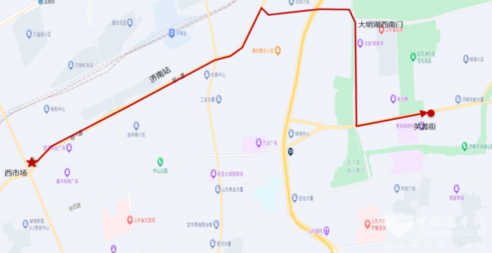 线路走向:经一路向东—明湖西路向东—济安街向南—少年路向东—趵突泉北路向南—泉城路向东。