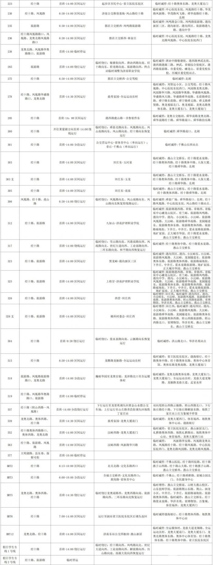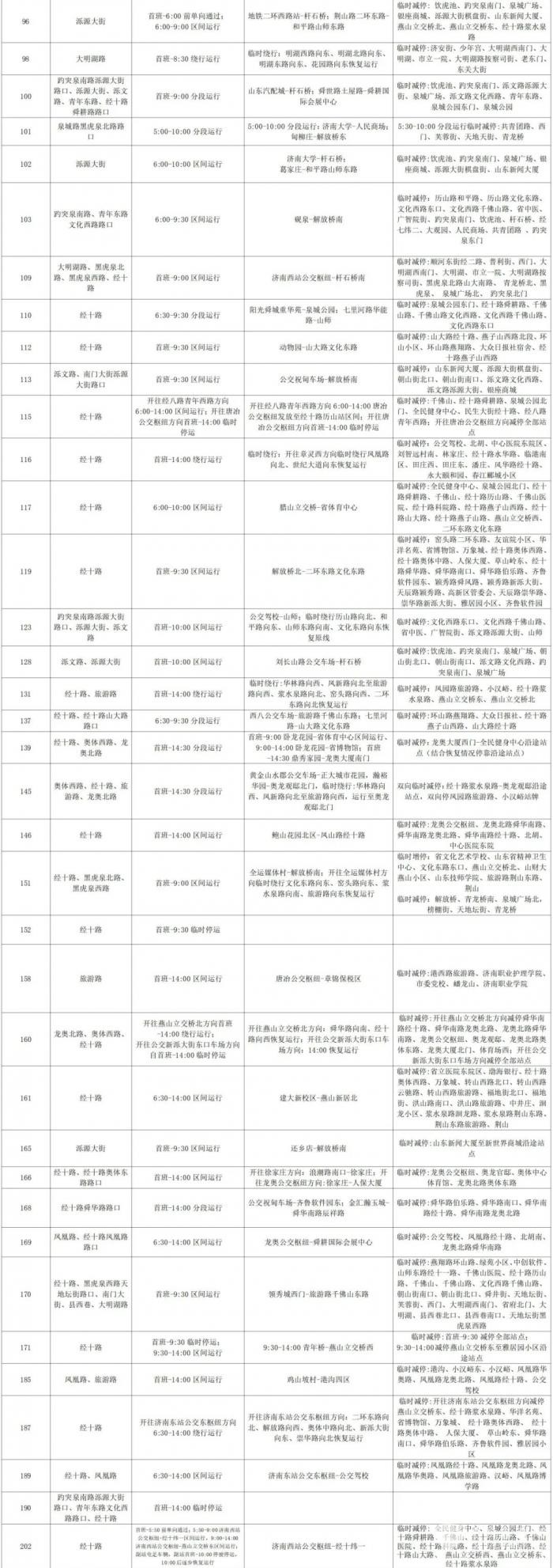 济南公交根据具体管制路段及管制时间,结合线路走向以及客流特点,确定116条线路临时调整方案,其中临时绕行线路共18条、临时分段运行线路26条、临时区间运行线路63条、临时停运线路9条。广大乘客市民可拨打96190济南公交客服热线咨询线路相关情况,也可登录369出行APP、济南公交官方微信公众号、官方微博查询线路调整情况。