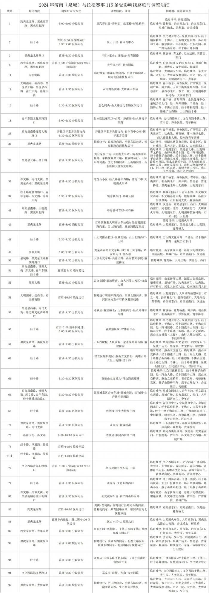 为助力2024年济南(泉城)马拉松赛事,保障市民乘客正常出行,2024年10月27日,在赛事举行当天,济南公交将配合道路管制情况,临时调整116条线路,并开通8条临时免费摆渡线,请广大市民乘客根据具体线路调整信息,合理安排出行计划。