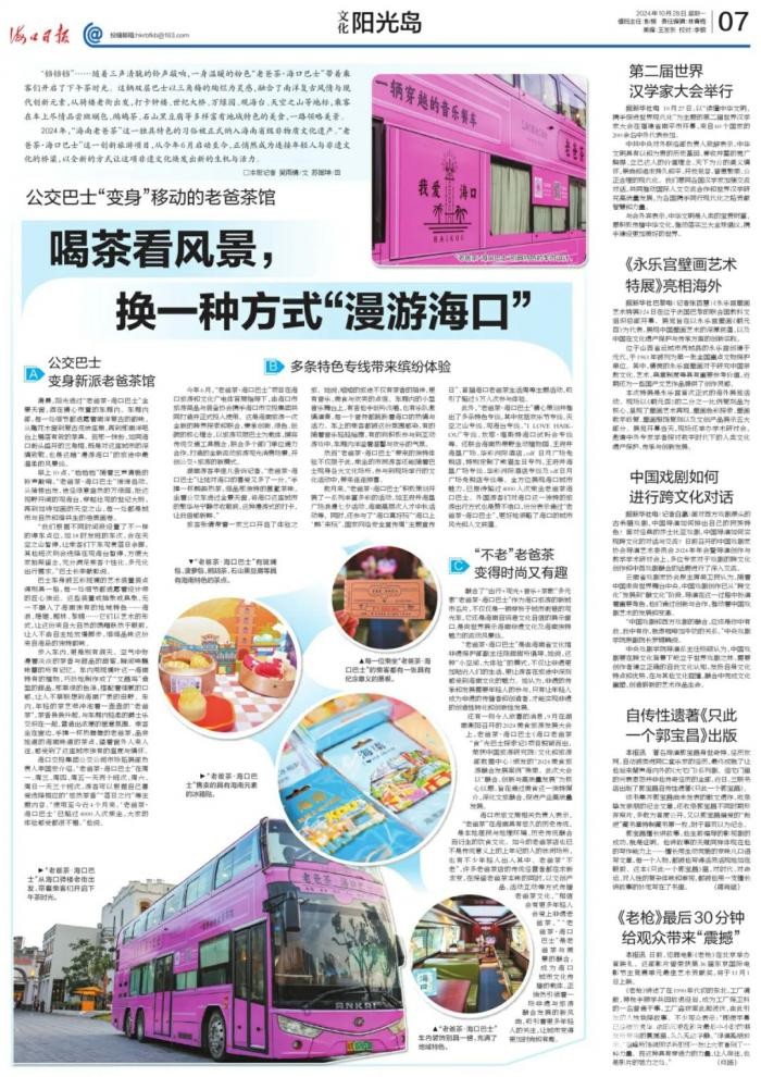 清晨,阳光透过“老爸茶·海口巴士”全景天窗,洒在精心布置的车厢内。车厢内部,每一处细节都透露着南洋复古的韵味,从雕花木窗到复古皮质座椅,再到那南洋吧台上错落有致的茶具。而那一抹粉,如同海口街头盛开的三角梅,既是对这座城市的深情致敬,也是这趟“漫游海口”的旅途中最温柔的风景线。早上10点,“铛铛铛”随着三声清脆的铃声敲响,“老爸茶·海口巴士”缓缓启动。从骑楼出发,途经绿意盎然的万绿园,抵达视野开阔的观海台,穿越壮观的世纪大桥,再到如诗如画的天空之山,每一处都是城市与自然和谐共生的绝美画卷。“我们根据不同时间段设置了不一样的停车点位,如18时发班的车次,会在天空之山暂停,让乘客们下车观赏落日余晖,其他班次则会选择在观海台暂停,方便大家拍照留念,充分满足乘客个性化、多元化出行需求。”巴士长李献戟说。巴士车身被五彩斑斓的艺术装置装点得别具一格,每一处细节都透露着设计师的匠心独运。这些装置或抽象或具象,无一不融入了海南独有的地域特色——海浪、珊瑚、椰林、黎锦……它们以艺术的形式,让这份来自大自然的馈赠跃然于眼前,让人不由自主地放慢脚步,细细品味这份来自海岛的独特韵味。步入车内,更是别有洞天。空气中弥漫着淡淡的茶香与甜品的甜蜜,瞬间唤醒味蕾的所有记忆。车内用斑斓叶这一海南特有的植物,巧妙地制作成了“文昌鸡”造型的甜品,那翠绿的色泽,搭配着细腻的口感,让人不禁联想到海南广袤的田野。车内,年轻的茶艺师冲泡着一壶壶的“老爸茶”,茶香袅袅升起,与车厢内轻柔的爵士乐交织在一起,营造出浓厚的惬意氛围。乘客坐在窗边,手捧一杯热腾腾的老爸茶,品尝地道的海南味道的茶点,望着窗外人来人往,感受到了这座城市独有的温度与情怀。