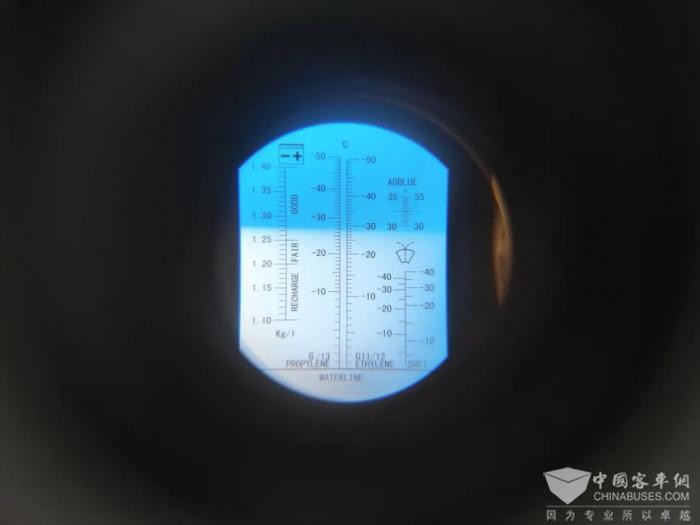 为了有效推动“冰点检测”工作的顺利进行,场区内每一辆参与运营的公交车辆都要进行细致检查。检测过程中,机务保障人员手持一部形似“望远镜”的高精度的冰点测试仪,认真检查着水箱冷却液的冰点和液位,确保冷却液性能符合相关要求,避免极寒天气下出行凝结现象。