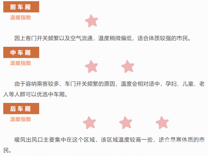 因上下客开关门以及暖风出风口数量不一,乘客对温度的感知也不相同,济南公交出行管家根据测量的温差,对车厢区域进行划分,市民可根据温度指数,选择适合自己的舒适区域:
