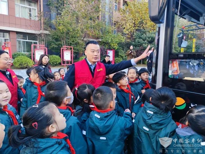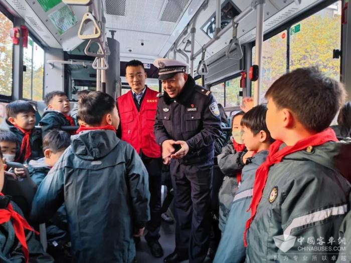 “同学们,现在天气越来越冷,公交车来了我们应该怎么注意乘车安全呀?”在经开外国语小学广场,公交志愿者带领同学们有序登上公交车,向孩子们讲解如何安全正确地上下车以及乘车时注意事项、如何安全站立等。公交志愿者通过现场提问的方式,为小朋友普及公交车内的灭火器、安全锤的使用方法,详细讲述公交车门应急开关及逃生窗的位置,并通过现场互动,让同学们掌握了紧急情况下如何逃生自救,外出时身边有哪些潜在的危险,应该如何规避风险等常识。
