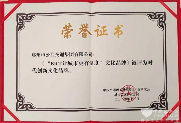 据悉,此次交通运输优秀文化品牌推选活动于4月份启动,由中国交通职工思想政治工作研究会城市公交行业分会举办。通过前期的材料报送、视频展示、现场推介宣传、文化成果展示等阶段,郑州公交集团快速公交公司“BRT让城市更有温度”党建文化品牌在从39家公交企业84个参选品牌中脱颖而出,荣获佳绩。