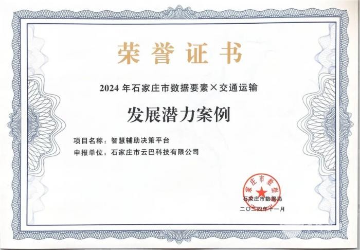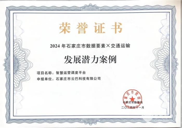 荣获“2024年石家庄市数据要素×交通运输发展潜力案例”,既是一种荣誉,也是一种鞭策。未来,云巴科技有限公司将继续秉承创新、务实、高效的企业精神,以科技创新引领企业发展,不断提升公共交通服务智慧化发展水平,为市民提供更加便捷、舒适的出行体验。