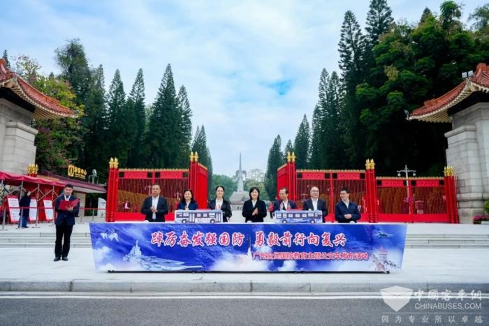 在启动仪式上,两台全民国防教育主题巴士呈“V”字型摆放在广州起义烈士陵园的门口,肃穆地守护在广州起义纪念碑前。