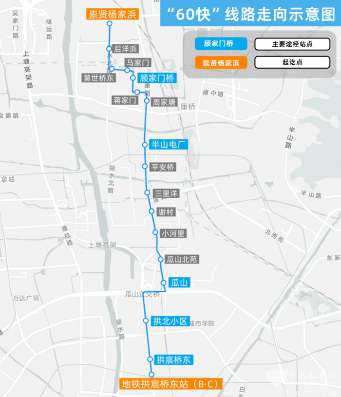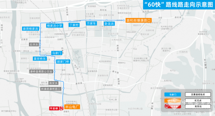 早高峰时段,“60快”从崇贤杨家浜开往地铁拱宸桥东站,这是考虑到了住在崇贤、瓜山、拱北区域的市民换乘地铁的出行需求;而晚高峰时段的“60快”则是从半山电厂(地铁平安桥站)开往崇杭街塘康路口,集中接驳下班后从地铁平安桥出站回崇贤方向的市民。