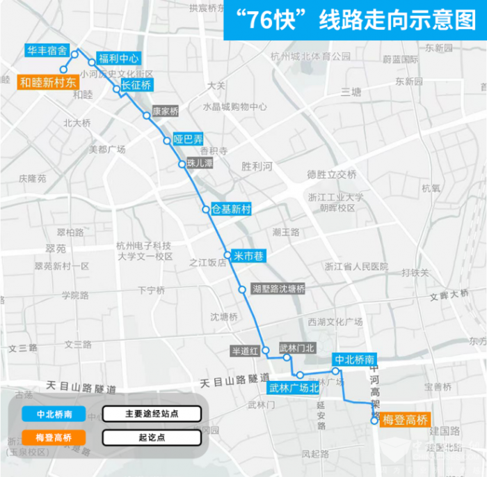以“76快”为例,7路在早高峰时段出场时的空驶路段以“76快”这一“大站快线”的形式,由和睦新村东开往梅登高桥,顺路将沿途的乘客更快速地带到目的地,有效缓解了早高峰时段通勤压力。