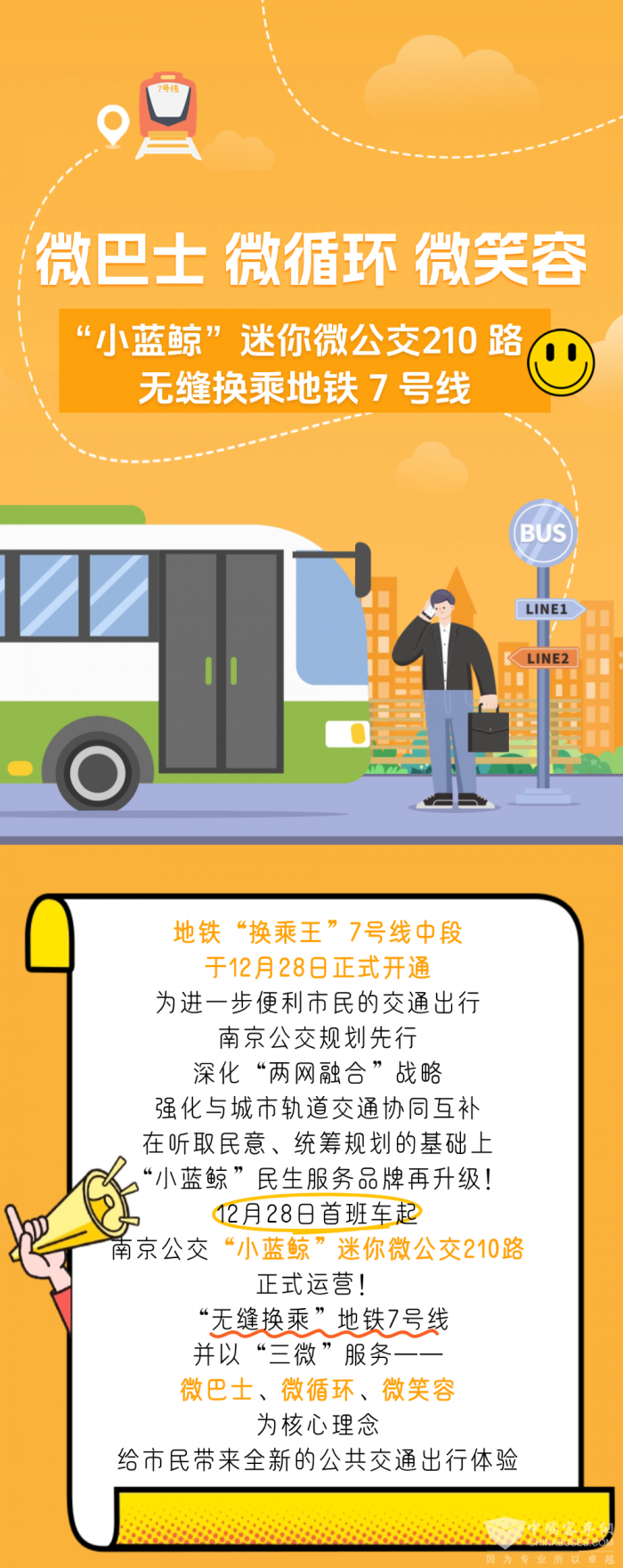 南此次新辟的“小蓝鲸”迷你微公交210路,是南京公交立足民生需求,经过实地考察走访周边环境,广泛吸纳市民心声与鼓楼区人大代表、下关街道议政代表的建言,并依托现有公交线网布局而精心规划的。210路的开通不仅填补了区域空白,还与地铁7号线无缝换乘,缩短市民出行最后一公里,再次践行了“地铁到站,公交到家”的服务理念。截至目前,南京公交“小蓝鲸”微循环线路累计50条。