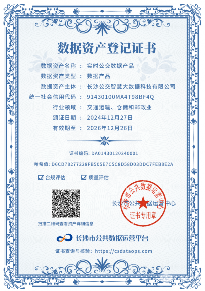 2024年12月27日,长沙市公共数据运营中心正式向长沙公交集团智慧公司颁发了“实时公交数据产品”的数据资产登记证书,这标志着长沙公交集团在全省公交行业率先实现了数据资产入表,在数据资产管理领域迈出了重要一步,为集团的持续发展和数字化转型奠定了坚实基础。