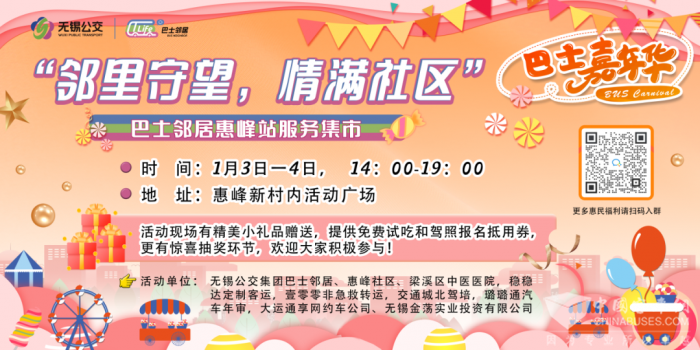 2025年1月3日~1月4日下午14点至19点,无锡公交集团联合惠峰社区在惠峰新村内活动广场开展“巴士嘉年华——邻里守望、情满社区”服务集市活动。本次活动既提供巴士邻居内部惠民产品的免费试吃,又有稳稳达定制客运、壹零零非急救转运、交通城北驾培、璐璐通汽车年审、大运通享网约车公司等兄弟单位的支持,更邀请了梁溪区中医医院和无锡金荡实业投资有限公司的鼎力加盟。