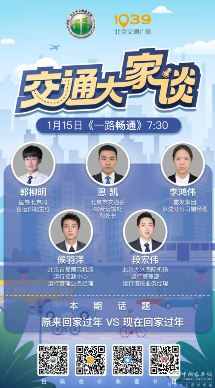 本期的《交通大家谈》邀请到北京市交通委综合运输处副处长 恩凯、国铁北京局客运部副主任 郭柳明、北京首都国际机场运行控制中心运行管理业务经理 侯羽泽、北京大兴国际机场运行管理部运行值班业务经理 段宏伟、首发集团京沈分公司副经理 李鸿伟做客直播间,一起聚焦2025年春运保障。