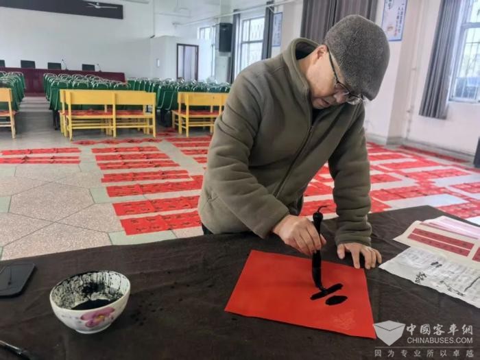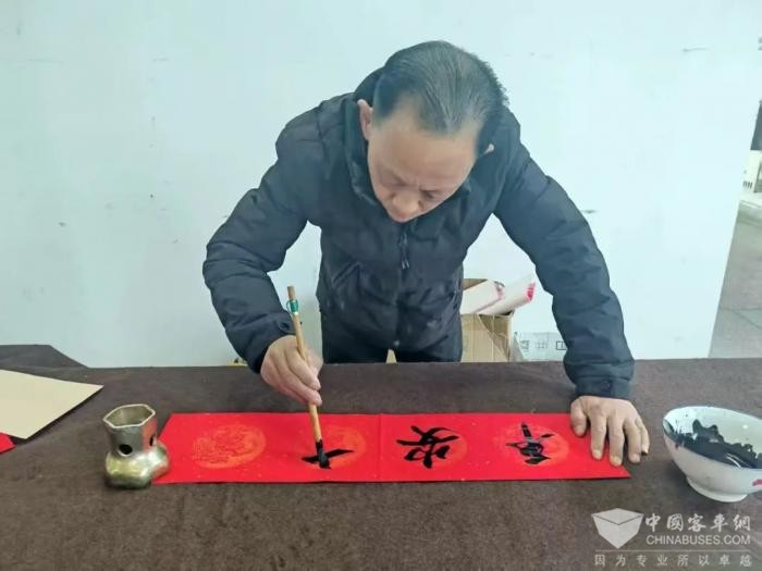 公交书法爱好者齐聚一堂,为职工挥毫泼墨义写春联,一笔一划饱含深情,一副副寓意吉祥的春联跃然纸上。