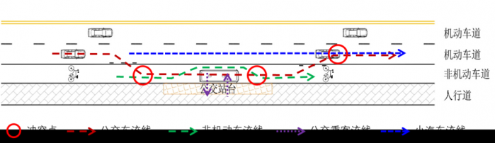 沿人行道设置的公交车停在右侧机动车道上的港湾式公交停靠站处的交通冲突主要是进站公交车与非机动车的交通冲突、非机动车与出站公交车的交通冲突、出站公交车与小汽车的交通冲突。