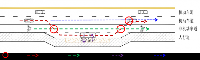 沿人行道设置的公交车停在右侧机动车道上的直线式公交停靠站处的交通冲突主要是人行道至公交站台的公交乘客与非机动车之间的交通冲突。