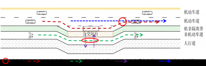 沿机非隔离带设置的港湾式公交停靠站处的交通冲突主要是人行道至公交站台的公交乘客与非机动车之间的交通冲突、出站公交车与小汽车的交通冲突。