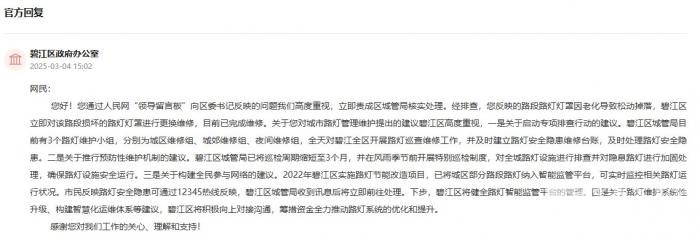关于网友对城市路灯管理维护提出的建议,碧江区城管局也积极正面作出回应。